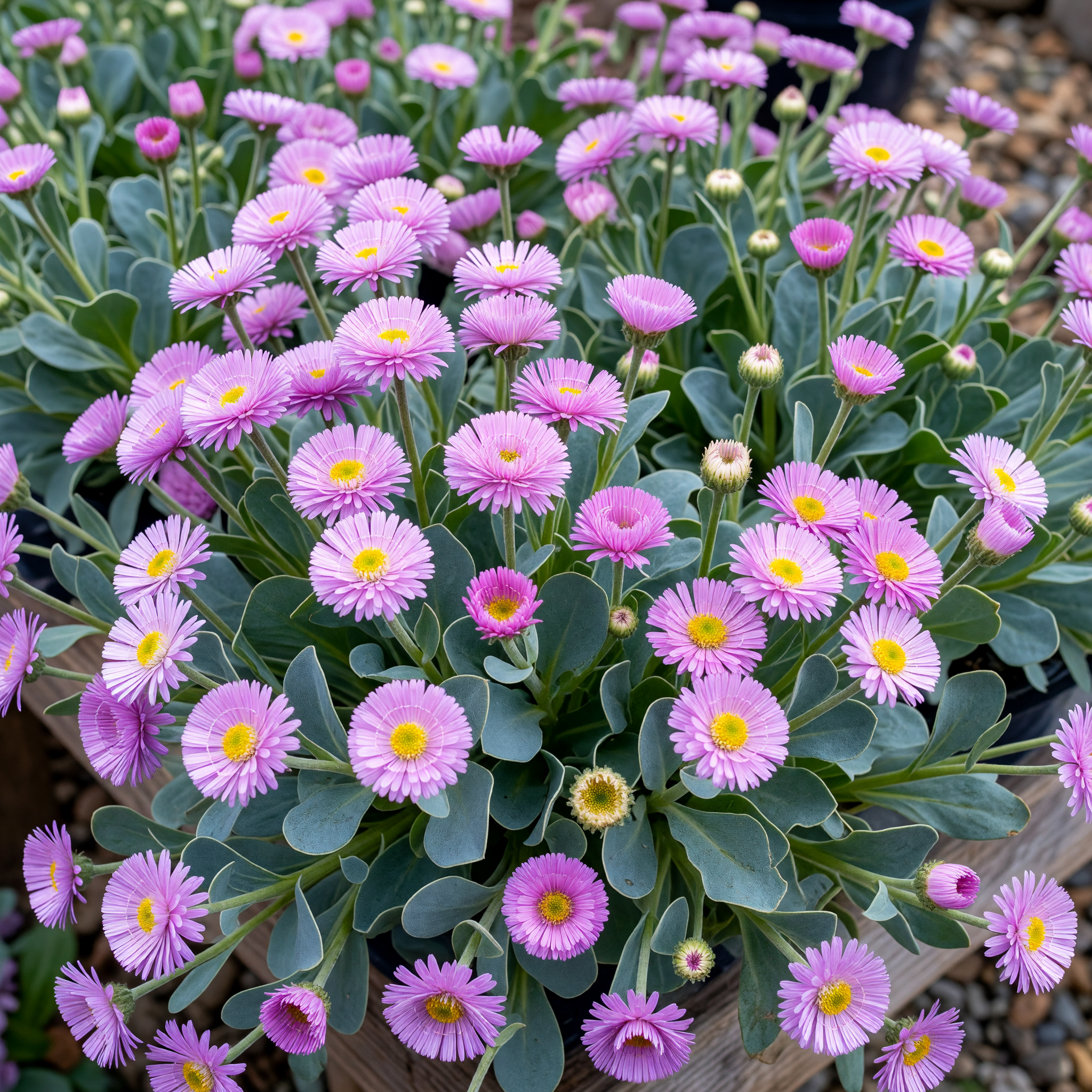 ‘Sea Breeze Mauve’ is a soft-coloured selection of beach aster, with masses of small mauve daisy-like flowers with yellow eyes covering the plant from late spring through summer. Fleshy grey-green semi-evergreen leaves form a dense mat just below the flowers.