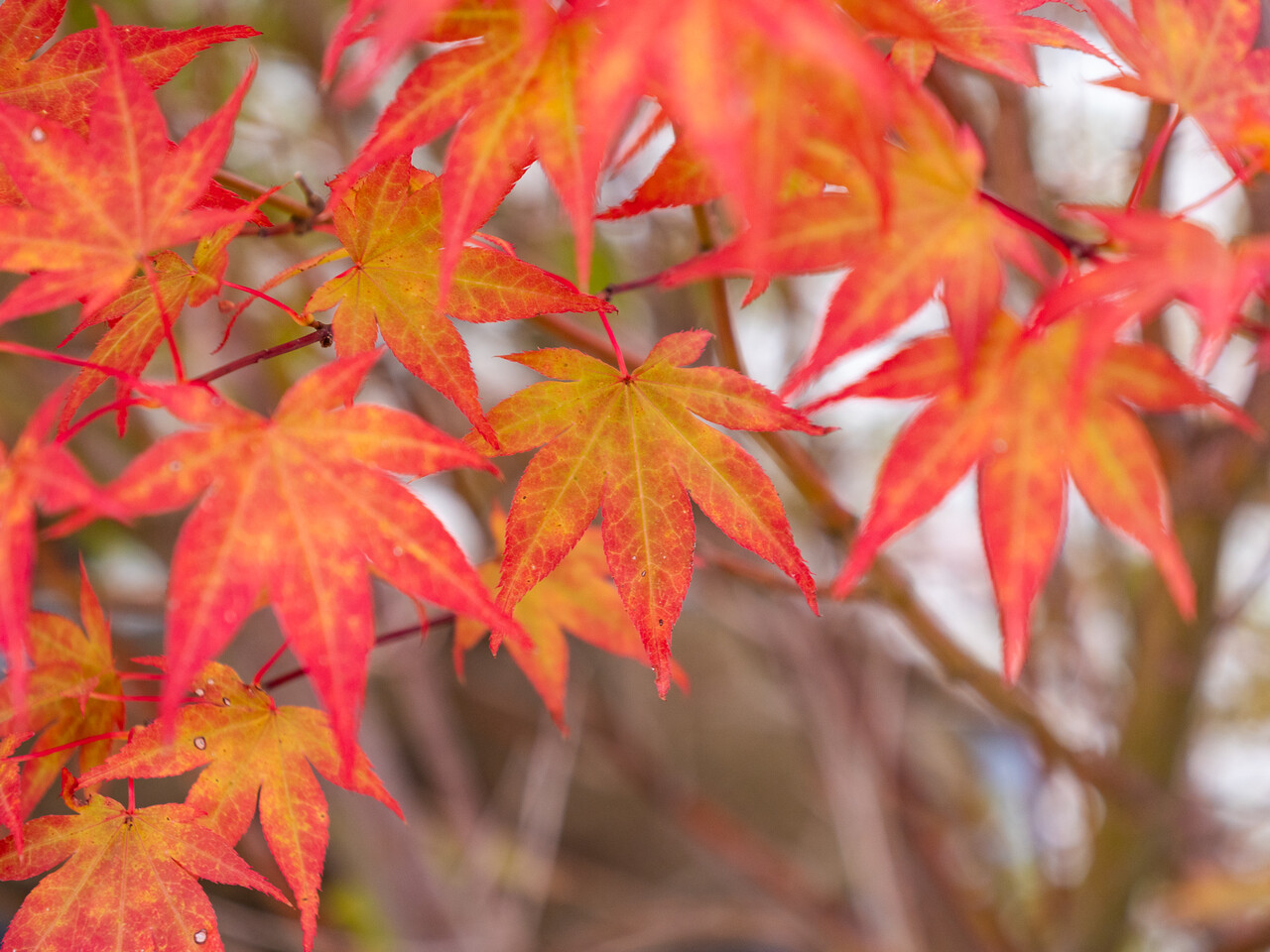 This cultivar presents deep purple-red leaves that emerge in spring and mature into crimson tones, transitioning spectacularly into vibrant scarlet and orange hues as autumn arrives, offering that sought-after spectacular autumn foliage display; it develops a bushy and broadly spreading shape, naturally forming a graceful, multi-stemmed large shrub or small tree.