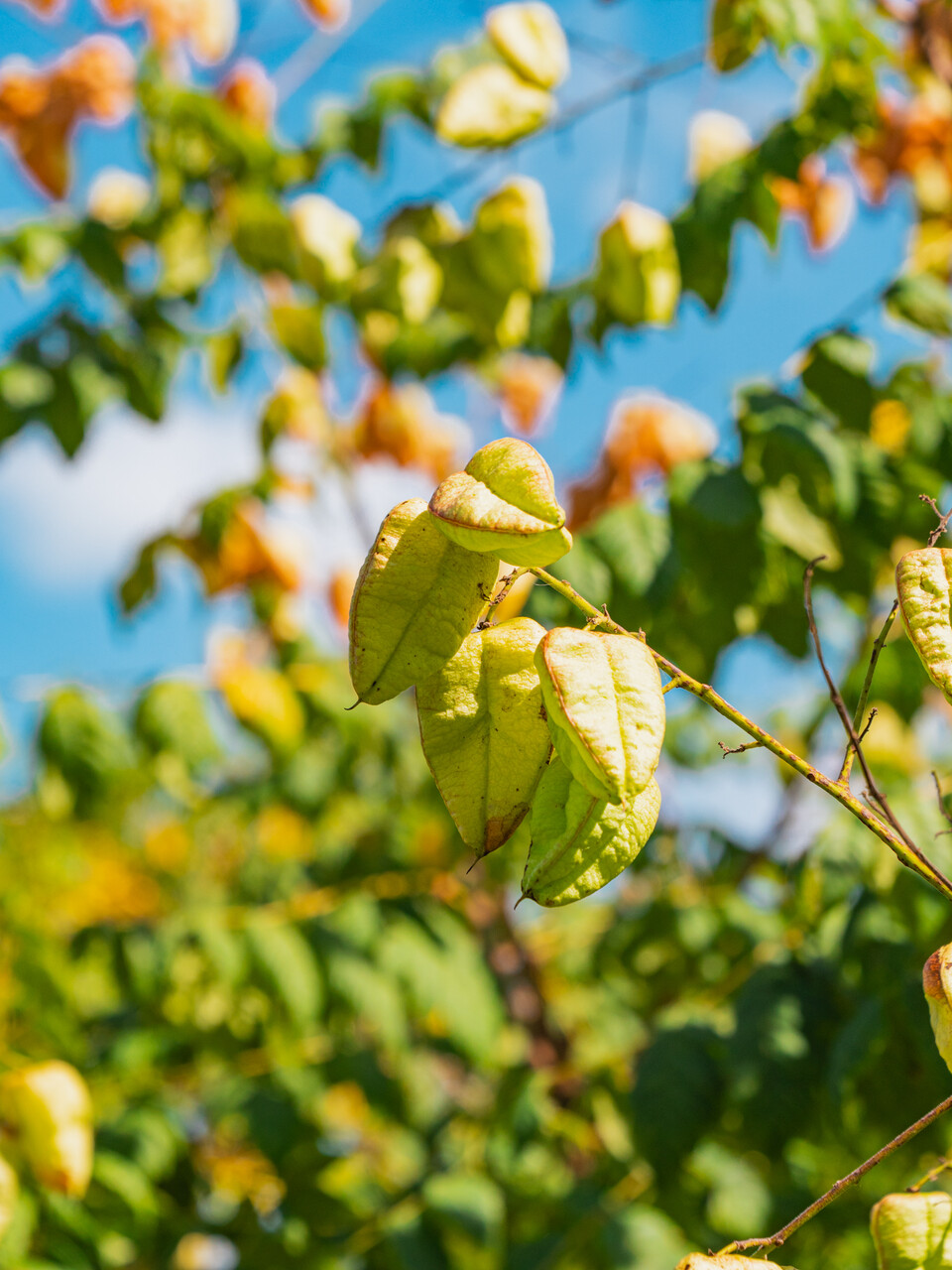 This tree develops a broadly spreading shape with a rounded, airy crown, forming an elegant, umbrella-shaped canopy that provides dappled shade; its seasonal display includes bright yellow blooms in July and August, followed by conspicuous, bladder-like seed pods that turn shades of bronze, pink, green, and tan, complemented by superb autumn color ranging from yellow to copper brown.